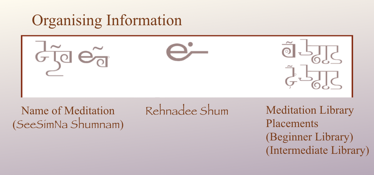 We will use two meditation maps to learn how to read and use them. The first is a Beginner Level meditation that illustrates all the elements of a meditation map used in the practice of Rehnadee Shum's Dynamic Meditation–Shumnam. The second is a meditation map that is used for study and reading that is part of Rehnadee Shum's Academy.