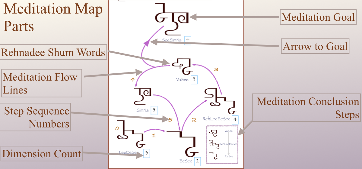 - Meditation Flow Lines and the Step Sequence Numbers connect all the steps of the meditation from 0 to however many number of words (not including the goal) on the map. Step 0 is preparation done prior to meditation followed by Step 1 which begins the meditation.